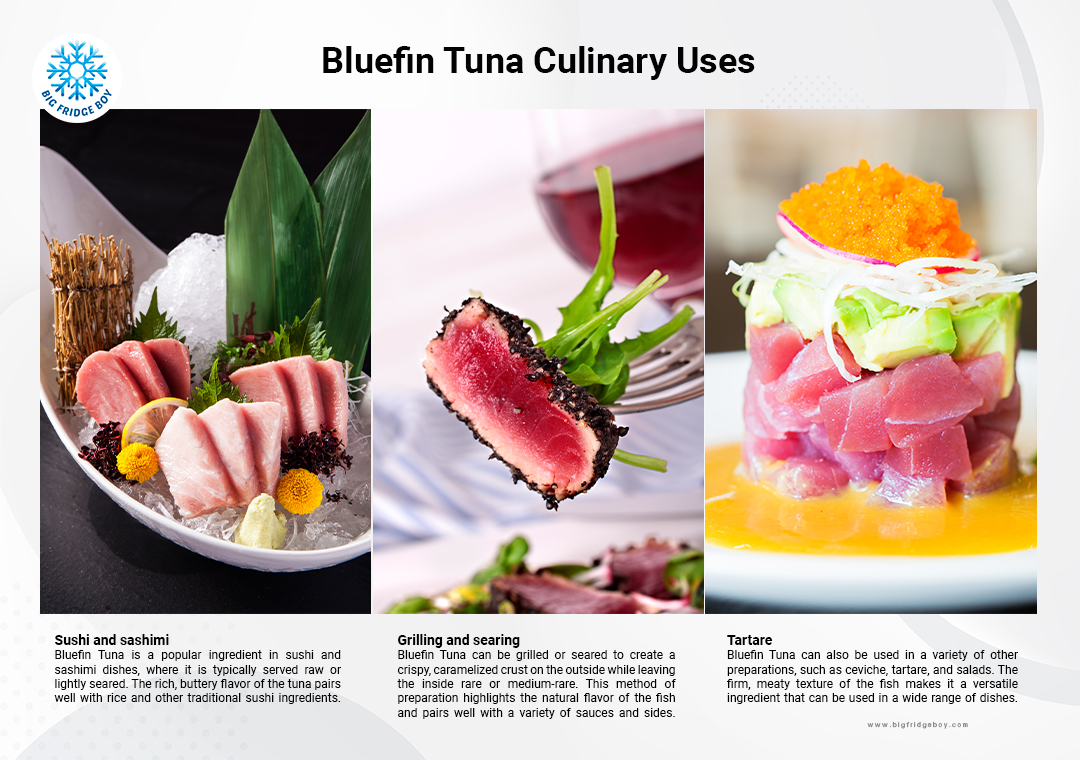 Bluefin Tuna is a highly prized fish for its rich, flavorful meat, which is high in healthy omega-3 fatty acids. It is a versatile fish that can be prepared in a variety of ways, and it is particularly popular in Japanese cuisine. Here are some common culinary uses for Bluefin Tuna: