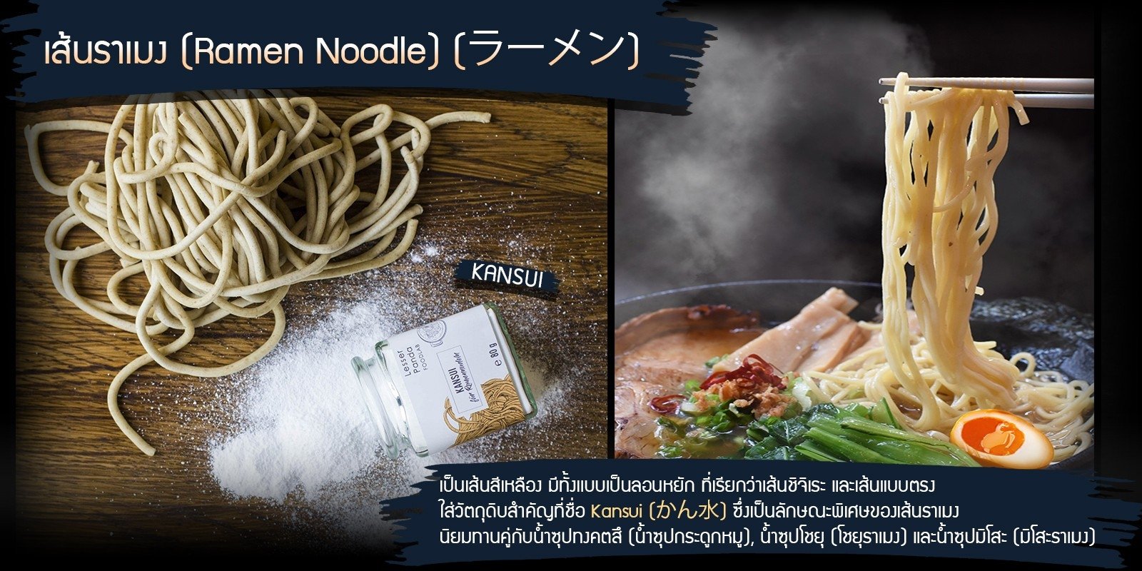 1. เส้นราเมง (Ramen Noodle) (ラーメン) จะมีลักษณะเป็นเส้นสีเหลือง มีทั้งเเบบเป็นลอนหยัก ที่เรียกว่าเส้นชิจิเระ และเส้นแบบตรง เส้นราเมงจะทำมาจากแป้งสาลีเป็นหลักมีความเหนียว นุ่ม และที่เป็นลักษณะพิเศษของเส้นราเมงคือ จะใส่วัตถุดิบสำคัญอีกอย่างที่ชื่อ Kansui (かん水) ซึ่งจะเปลี่ยนทั้งรสชาติและเนื้อสัมผัสของบะหมี่ธรรมดา ทำให้รู้สึกถึงกลิ่นของเส้นราเมงในปากเวลาเคี้ยว และทำให้เส้นราเมงมีความยืดหยุ่นมากกว่าบะหมี่ธรรมดา ซึ่งทำให้เป็นข้อแตกต่างระหว่างเส้นราเมง (Ramen Noodle) กับเส้นบะหมี่ธรรมดา เส้นโซบะ (Soba) หรือเส้นอุ้ง (Udon) อย่างชัดเจน ในส่วนของการทานเส้นราเมงนี้นิยมทานคู่กับน้ำซุปทงคตสึ (น้ำซุปกระดูกหมู), น้ำซุปโชยุ (โชยุราเมง), และน้ำซุปมิโสะ (มิโสะราเมง) 3 น้ำซุปนี้
