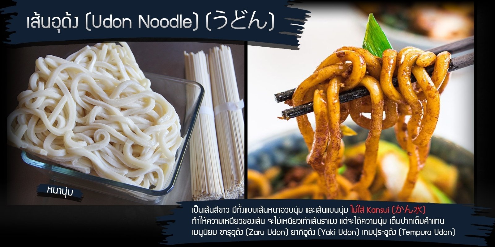 2. เส้นอุด้ง (Udon Noodle) (うどん) จะมีลักษณะเป็นเส้นสีขาว มีทั้งแบบเส้นหนาอวบนุ่ม และเส้นแบนนุ่ม วิธีการทำเส้นอุด้งคล้ายกับเส้นราเมง เพียงเเค่ไม่ได้ใส่วัตถุดิบ Kansui (かん水) ตัวนี้เท่านั้น ทำให้ความเหนียวของเส้นอุด้ง (Udon Noodle) จะไม่เหนียวเท่าเส้นราเมง (Ramen Noodle) แต่จะได้ความนุ่มเข้ามาเเทนที่ ทำให้เส้นอุด้งนิยมยืดเส้นให้หนา เพราะไม่ว่าจะทำเส้นอุด้งให้หนาเพียงใดเส้นก็ยังคงความนุ่มได้ดี เเละยังทำให้เต็มปากเต็มคำด้วย เส้นอุด้งนี้มีความอเนกประสงค์ให้การใช้งานมากๆ สามารถทำได้หลากหลายเมนู จะทานแบบธรรมดาเป็นเส้นอุด้งคู่กับน้ำซุปทงคตสึเป็น (Tonkotsu Udon) ก็ได้ จะทานแบบเย็นเป็นซารุอุด้ง (Zaru Udon) ก็ได้ จะนำไปผัดเป็นยากิอูด้ง (Yaki Udon) ก็ได้ หรือจะนำไปใส่ในแกงกะหรี่หน้าเทมปุระต่างๆทำเป็นเทมปุระอูด้ง (Tempura Udon) ก็ได้
