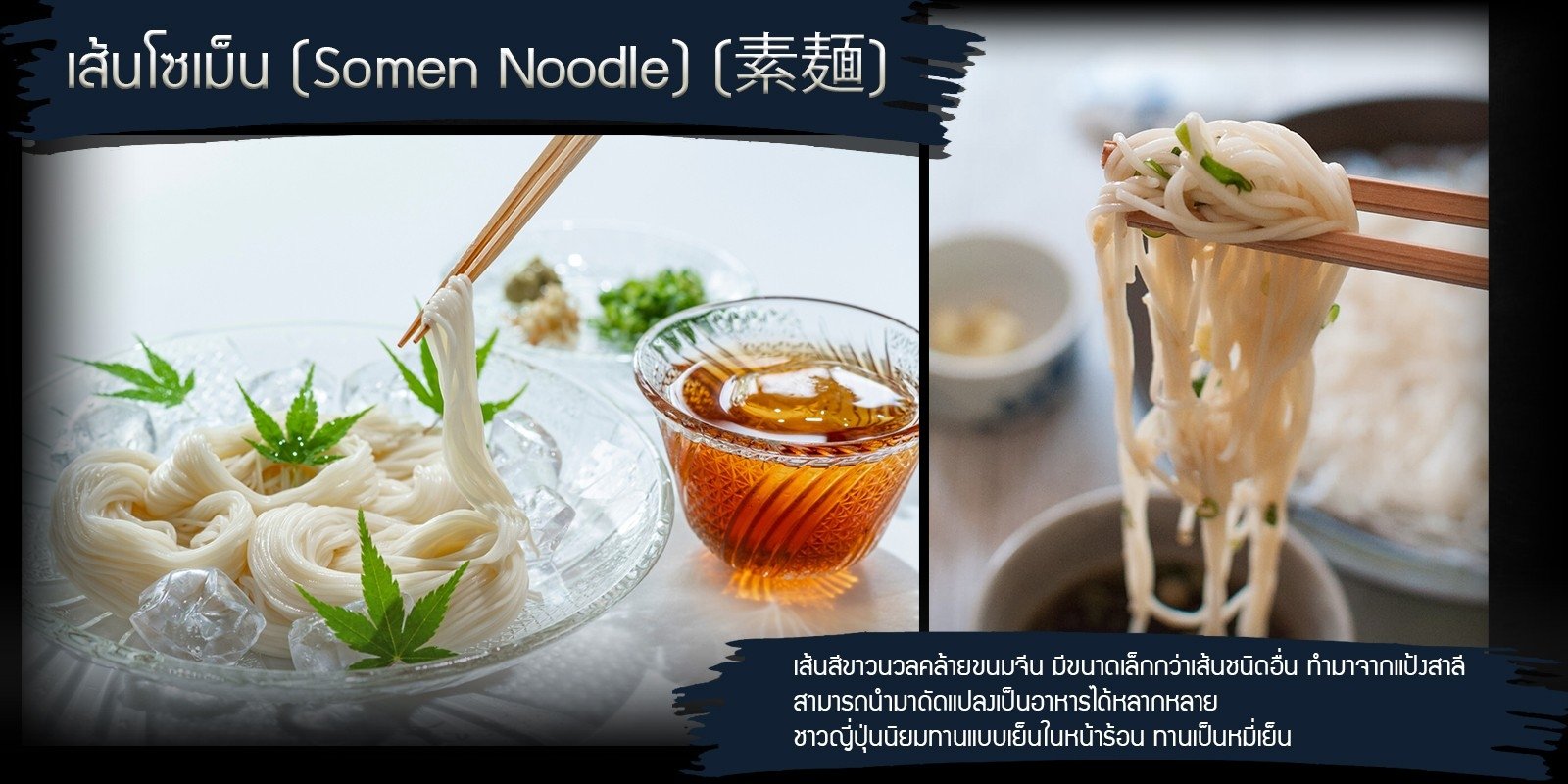 4.1 เส้นโซเม็น (Somen Noodle) (素麺) จะมีลักษณะเป็นเส้นสีขาวนวลคล้ายขนมจีน มีขนาดเล็กกว่าเส้นชนิดอื่น ๆ ทำมาจากแป้งสาลี เส้นโซเม็น (Somen Noodle) สามารถนำมาดัดแปลงเป็นอาหารได้หลากหลาย และเป็นเส้นที่ชาวญี่ปุ่นนิยมทานแบบเย็นในหน้าร้อน ทานเป็นหมี่เย็น