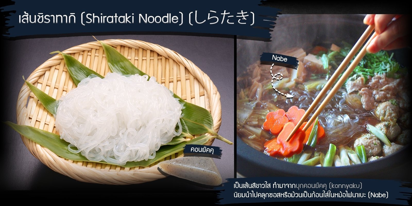 4.2 เส้นชิราทากิ (Shirataki Noodle) (しらたき) จะมีลักษณะเป็นเส้นสีขาวใส เส้นชิราทากิ (Shirataki Noodle) ทำมาจากบุกคอนยัคคุ มักนำไปคลุกซอสหรือม้วนเป็นก้อนใส่ในหม้อไฟนาเบะ (Nabe) ก็ได้