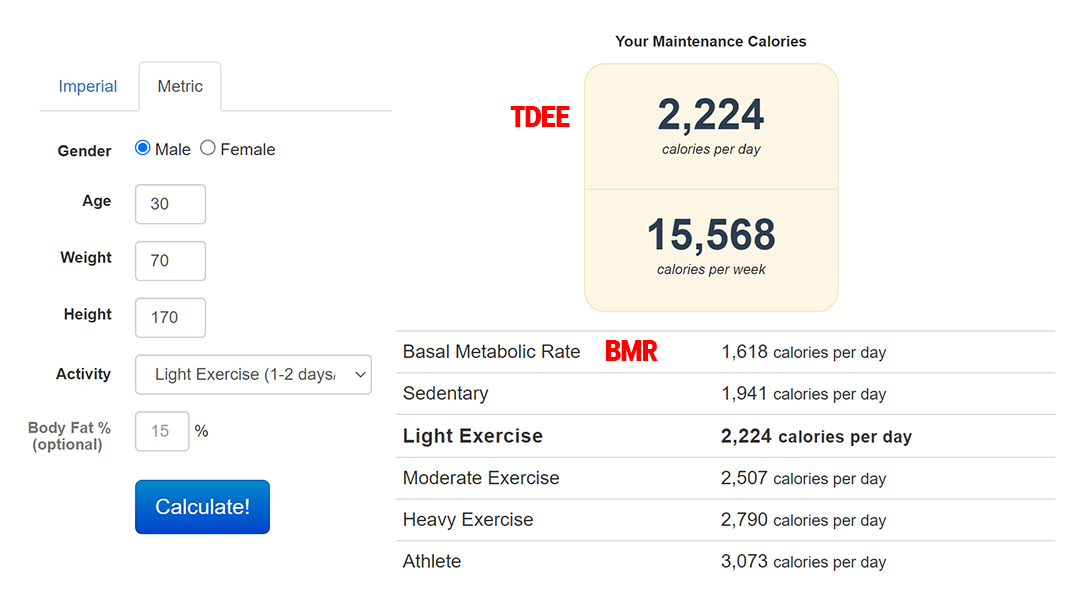 วิธีหาค่า TDEE และ BMR ของตัวเราแบบคร่าวๆ ให้เราเสิร์ชคำว่า TDEE calculator จะใช้ของเว็บไหนก็ได้ ณ ที่นี้อ้างอิงจาก https://tdeecalculator.net/