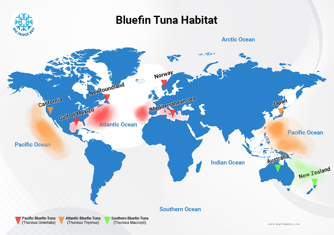ปลาทูน่าครีบน้ำเงินสามารถพบได้ในแหล่งที่อยู่อาศัยที่หลากหลายทั่วโลก เป็นปลาเลือดอุ่นที่ชอบอาศัยอยู่ในน่านน้ำเขตอบอุ่นและเขตร้อน