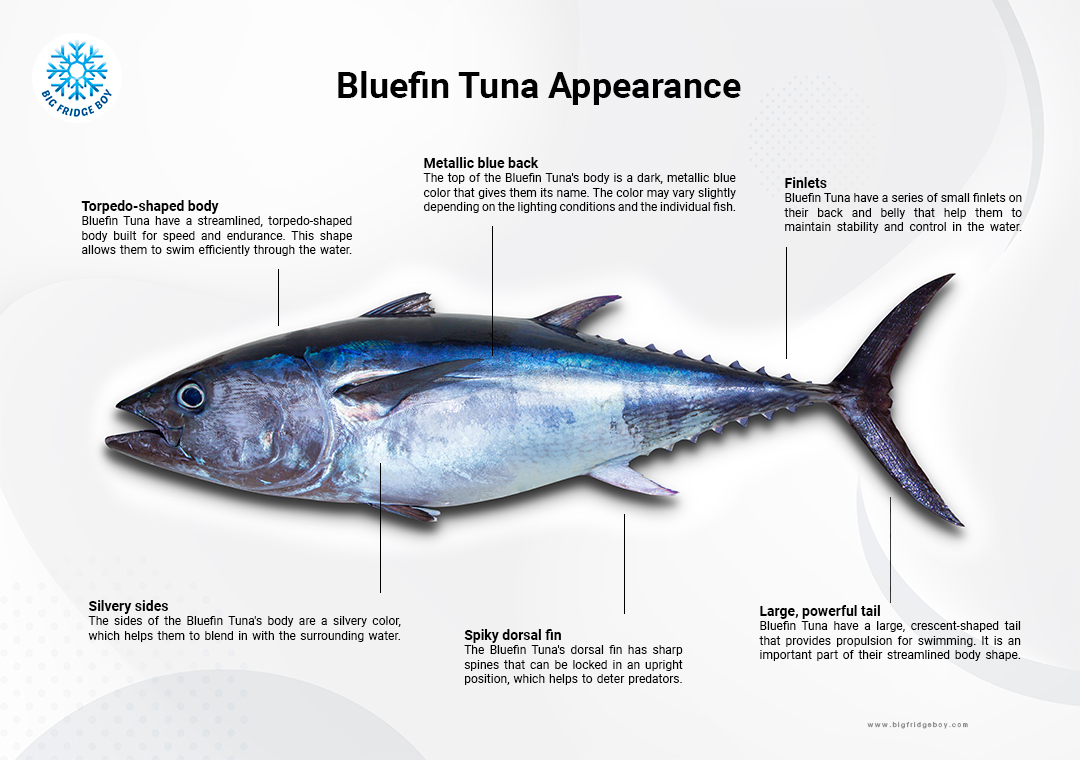โดยรวมแล้ว ปลาทูน่าครีบน้ำเงินมีรูปลักษณ์ที่โดดเด่นซึ่งสะท้อนถึงการปรับตัวที่เป็นเอกลักษณ์เฉพาะสำหรับชีวิตในมหาสมุทรเปิด รูปร่างที่ปราดเปรียว หางอันทรงพลัง และสีน้ำเงินเมทัลลิกทำให้ดูน่าเกรงขามเมื่ออยู่ในน้ำ