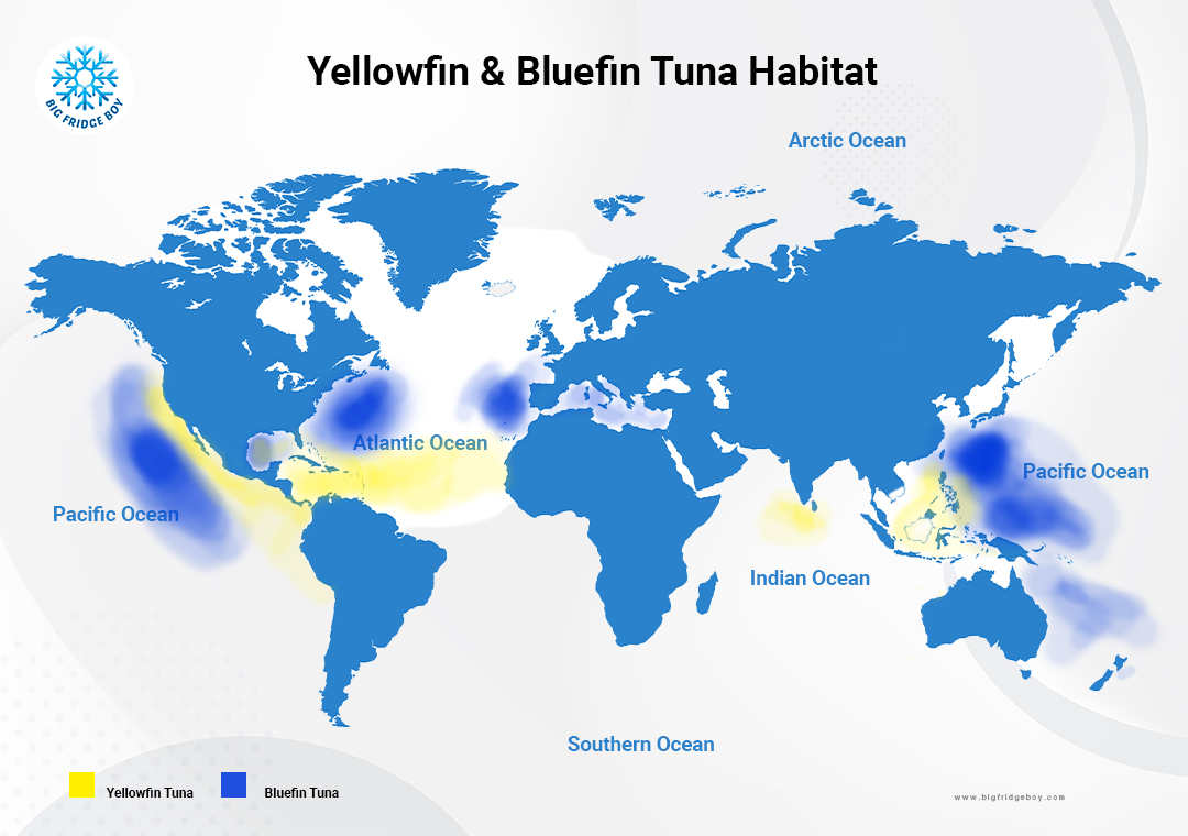 - ปลาทูน่าครีบน้ำเงิน ชอบน้ำที่เย็นกว่าและมักพบในน้ำอุณหภูมิปานกลางจนถึงเย็นของมหาสมุทรแอตแลนติก ทะเลเมดิเตอร์เรเนียน และบางส่วนของมหาสมุทรแปซิฟิก