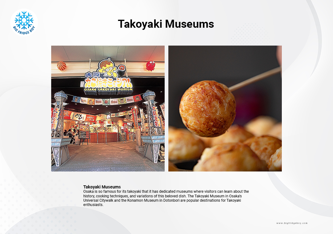 โอซาก้ามีชื่อเสียงด้านทาโกะยากิมากถึงขนาดมีพิพิธภัณฑ์เฉพาะที่ผู้เข้าชมสามารถเรียนรู้เกี่ยวกับประวัติศาสตร์ เทคนิคการทำ และอื่นๆของทาโกะยากินี้ พิพิธภัณฑ์ทาโกะยากิใน Universal Citywalk ของโอซาก้าและพิพิธภัณฑ์โคนามง (Konamon Museum) ในโดทงโบริเป็นสถานที่ยอดนิยมสำหรับผู้ชื่นชอบทาโกะยากิ