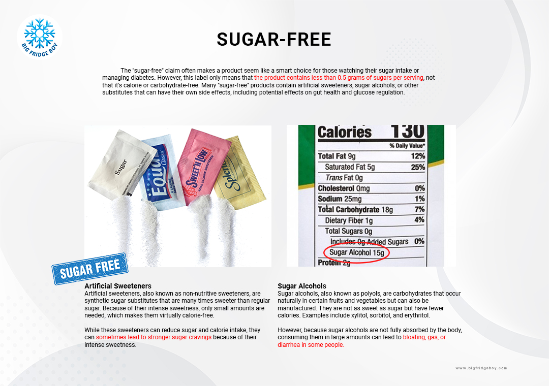 ฉลาก "ปราศจากน้ำตาล" มักทำให้ผลิตภัณฑ์นั้นสะดุดตาขึ้นมาทันที โดยเฉพาะสำหรับกลุ่มคนที่ใส่ใจในสุขภาพหรือผู้ที่เป็นเบาหวานอยู่ การได้มาของฉลากนี้หมายความขอแค่เพียงว่าผลิตภัณฑ์นั้นมีน้ำตาลน้อยกว่า 0.5 กรัมต่อหนึ่งหน่วยบริโภค ก็สามารถติดฉลากไม่มีน้ำตาลได้แล้ว แต่ก็ไม่ใช่ว่าไม่มีแคลอรี่หรือคาร์โบไฮเดรตเลย ผลิตภัณฑ์ที่ติดฉลาก "ปราศจากน้ำตาล" หลายชนิดมีสารให้ความหวานเทียม น้ำตาลแอลกอฮอล์ หรือสารทดแทนอื่นๆ ที่อาจมีผลข้างเคียง รวมถึงผลกระทบที่อาจเกิดขึ้นกับสุขภาพของลำไส้และการควบคุมระดับน้ำตาลในเลือดได้