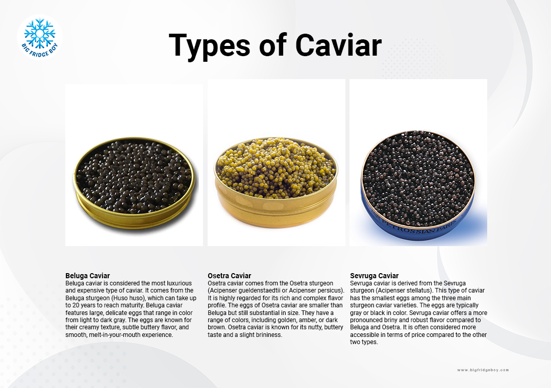 ประเภทคาเวียร์ที่เป็นที่รู้จักมากที่สุดจะมาจากปลาสเตอร์เจียน ได้แก่ เบลูก้า(Beluga) โอเซตรา(Osetra) และเซฟรูกา(Sevruga)