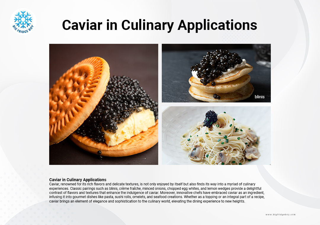ไข่ปลาคาเวียร์ขึ้นชื่อเรื่องรสชาติที่เข้มข้น ไม่เพียงแค่อร่อยด้วยตัวมันเองเท่านั้น แต่ยังใช้ร่วมกับการทำอาหารอื่นๆมากมายได้อีกด้วย การจับคู่แบบคลาสสิกเช่น blinis (แพนเค้กรัสเซียขนาดเล็ก), crème fraîche, หัวหอมสับ, ไข่ขาวสับ และเลมอนเป็นแว่นๆ ให้รสชาติและเนื้อสัมผัสที่ตัดกันอย่างลงตัวซึ่งช่วยเพิ่มอรรถรสของคาเวียร์ได้ หรือจะใช้เป็นท็อปปิ้งของอาหาร เช่น พาสต้า ซูชิโรล ออมเล็ต และอาหารทะเลก็ยังได้