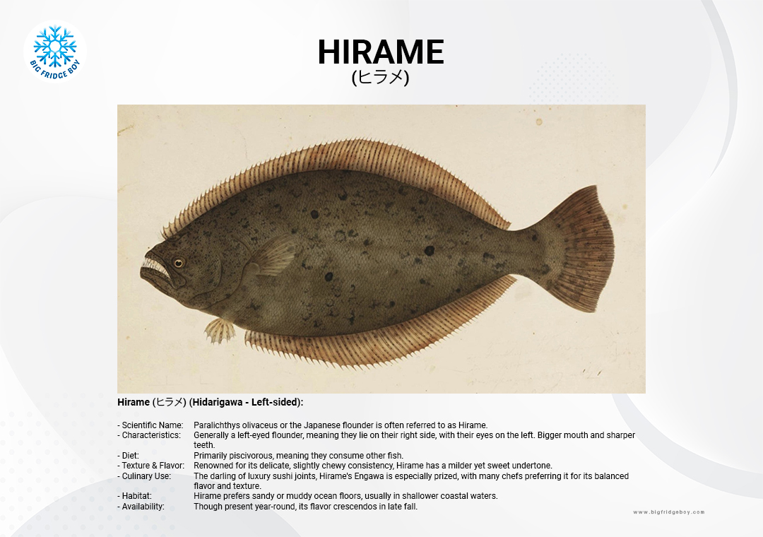 - ชื่อวิทยาศาสตร์: Paralichthys olivaceus หรือปลาลิ้นหมาญี่ปุ่น มักเรียกกันว่า ฮิราเมะ