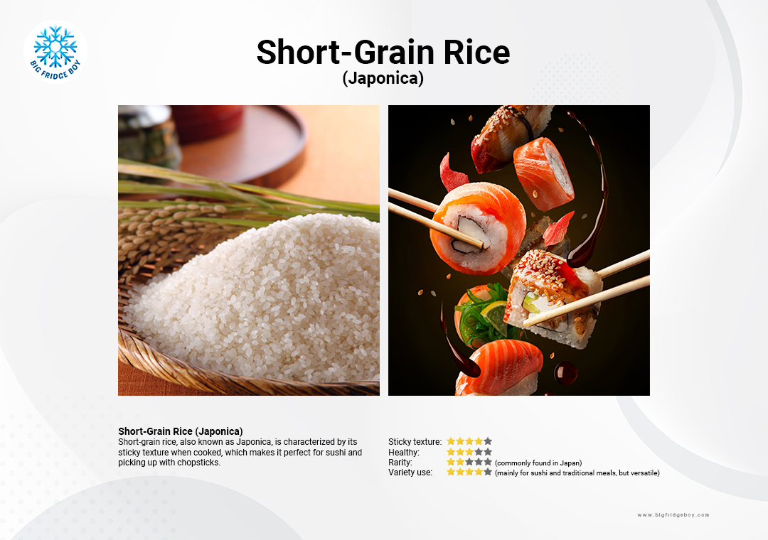 ประเภทข้าวพันธุ์เมล็ดสั้นหรือที่รู้จักกันในชื่อจาโปนิกา มีลักษณะพิเศษคือเนื้อสัมผัสที่เหนียวเมื่อถูกปรุงสุก ซึ่งเหมาะสำหรับการนำไปทำซูชิและอาหารที่ใช้ตะเกียบในการคีบ