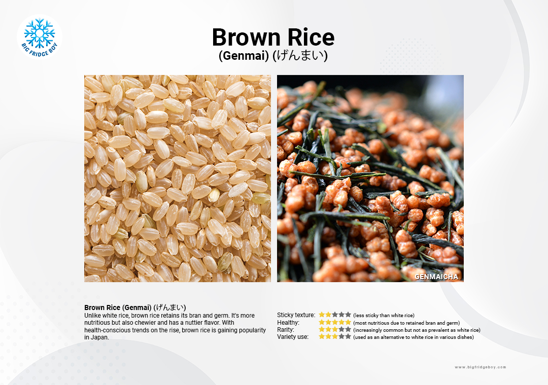 - การใช้งาน: ข้าวกล้องไม่ได้รับความนิยมเท่ากับข้าวขาวในญี่ปุ่น แต่ด้วยกระแสด้านสุขภาพที่เพิ่มมากขึ้น จึงถูกนำมาใช้ในอาหารญี่ปุ่นสมัยใหม่ ซึ่งเป็นทางเลือกที่ดีต่อสุขภาพแทนข้าวขาว นอกจากนี้ยังใช้ใน "เกนไมฉะ" ซึ่งเป็นส่วนผสมของชาเขียวกับข้าวกล้องคั่ว
