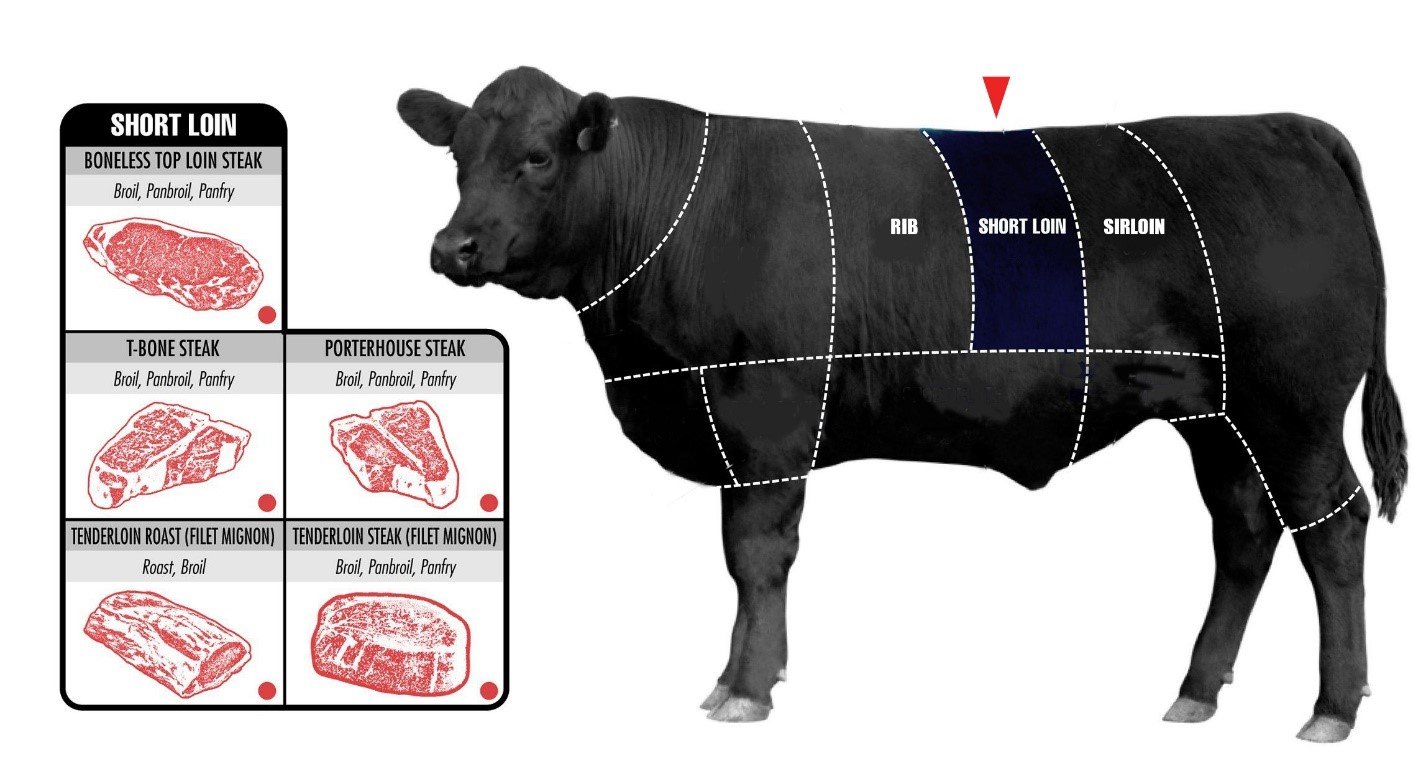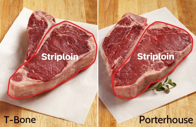หรือถ้าจะให้เห็นภาพมากขึ้นก็คือ T-Bone กับ Porterhouse จะมีส่วนที่มีเนื้ออยู่2ฝั่ง ผั่งที่มีไขมันอยู่ที่ขอบนอกนั่นก็คือ Striploin (เนื้อสันนอก) ส่วนฝั่งที่ชิ้นเล็กกว่าก็คือ Tenderloin (เนื้อสันใน) นั่นเอง