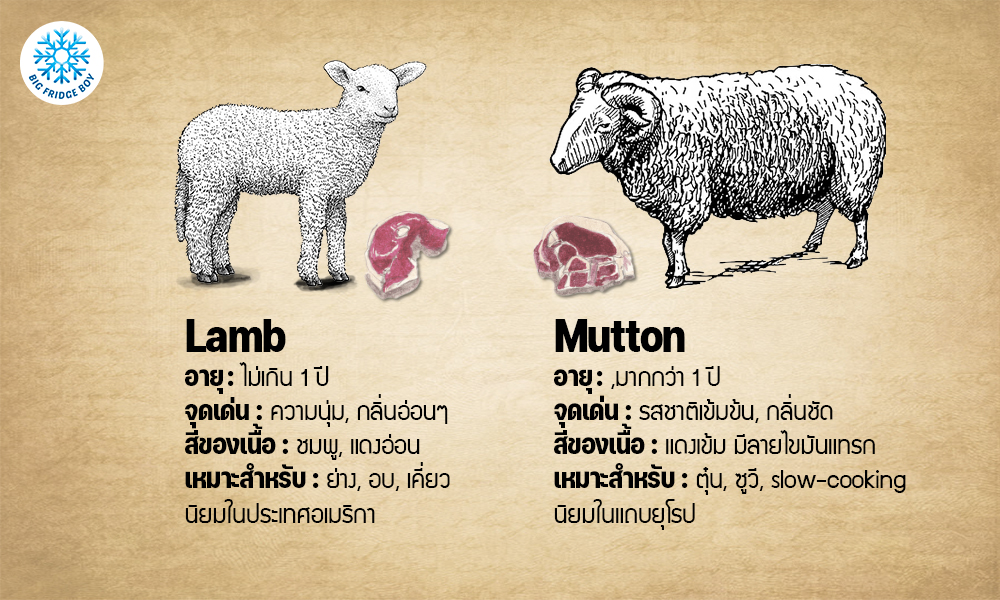 Lamb และ Mutton จริงๆ แล้วเป็นคำที่เอาไว้ใช้เรียกเนื้อแกะทั้งคู่ แต่ต่างกันที่ในแต่ละคำจะเอาไว้ใช้เรียกตามอายุของเนื้อแกะ