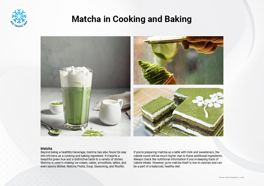 นอกเหนือจากการเป็นเครื่องดื่มที่ดีต่อสุขภาพแล้ว มัทฉะยังนิยมในฐานะส่วนผสมในการทำอาหารและการอบอีกด้วย มัทฉะให้สีเขียวที่สวยงามและรสชาติที่โดดเด่นแก่อาหารหลากหลายชนิด มัทฉะใช้ในการทำไอศกรีม เค้ก สมูทตี้ ลาเต้ และแม้แต่อาหารคาว เช่น พาสต้า ซุป ริซอตโต้ เป็นต้น