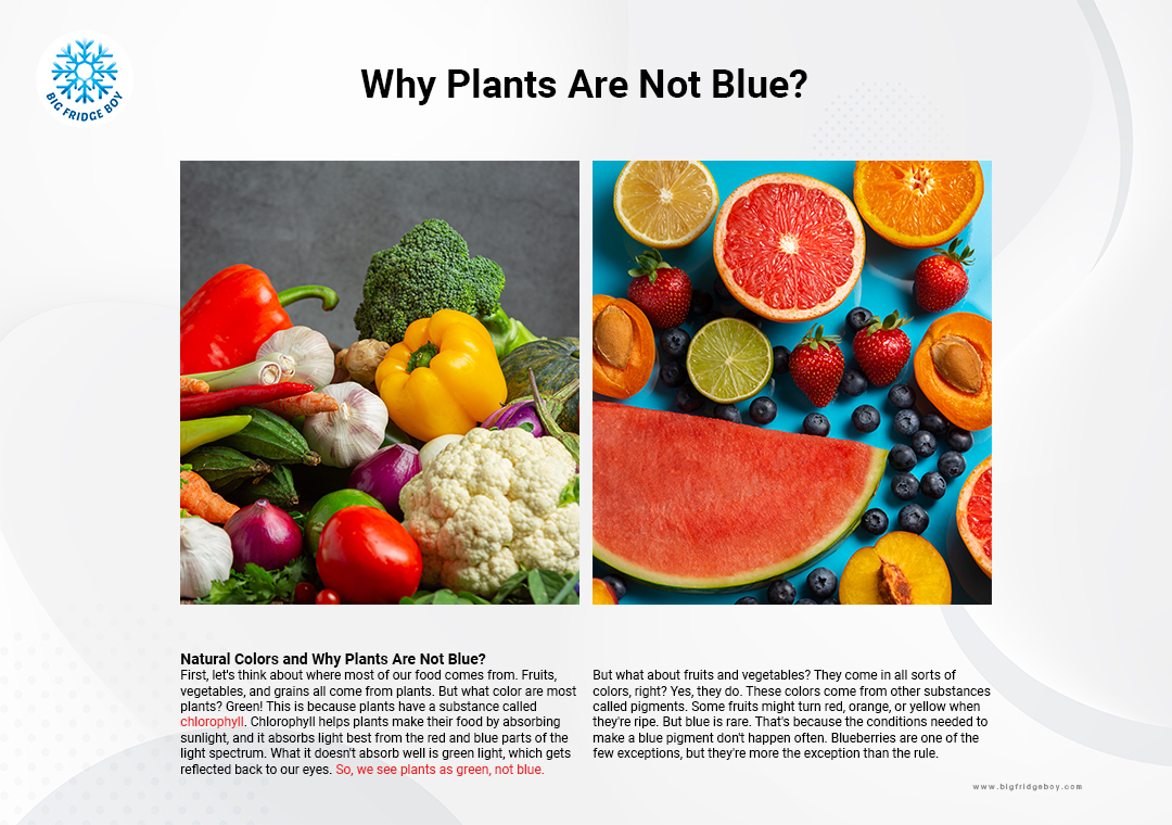 อันดับแรก ลองนึกถึงว่าอาหารส่วนใหญ่ของเรามาจากไหน ผลไม้ ผัก และธัญพืชล้วนมาจากพืช แต่พืชส่วนใหญ่มีสีอะไร? สีเขียว! เนื่องจากพืชมีสารที่เรียกว่าคลอโรฟิลล์ คลอโรฟิลล์ช่วยให้พืชสร้างอาหารโดยการดูดซับแสงแดด และดูดซับแสงได้ดีที่สุดจากส่วนสีแดงและสีน้ำเงินของสเปกตรัมแสง สิ่งที่ดูดซับได้ไม่ดีคือแสงสีเขียวซึ่งจะสะท้อนกลับมาที่ดวงตาของเรา ดังนั้นเราจึงเห็นพืชเป็นสีเขียวไม่ใช่สีน้ำเงินนั่นเอง