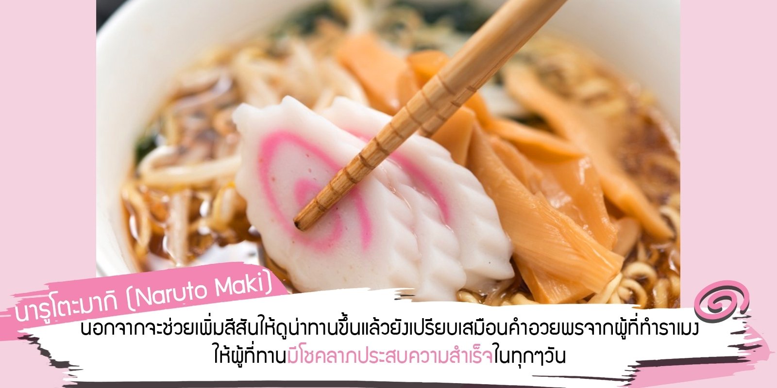 นารูโตะมากิ (Naruto Maki) สีสดใส ชมพู ขาว นอกจากจะช่วยเพิ่มสีสันให้ดูน่าทานขึ้นแล้วยังเปรียบเสมือนคำอวยพรจากผู้ที่ทำราเมง ให้ผู้ที่ทานมีโชคลาภประสบความสำเร็จในทุกๆวัน