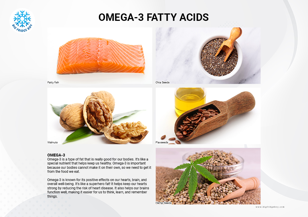 Omega-3 is known for its positive effects on our hearts, brain, and overall well-being. It's like a superhero fat! It helps keep our hearts strong by reducing the risk of heart disease. It also helps our brains function well, making it easier for us to think, learn, and remember things.