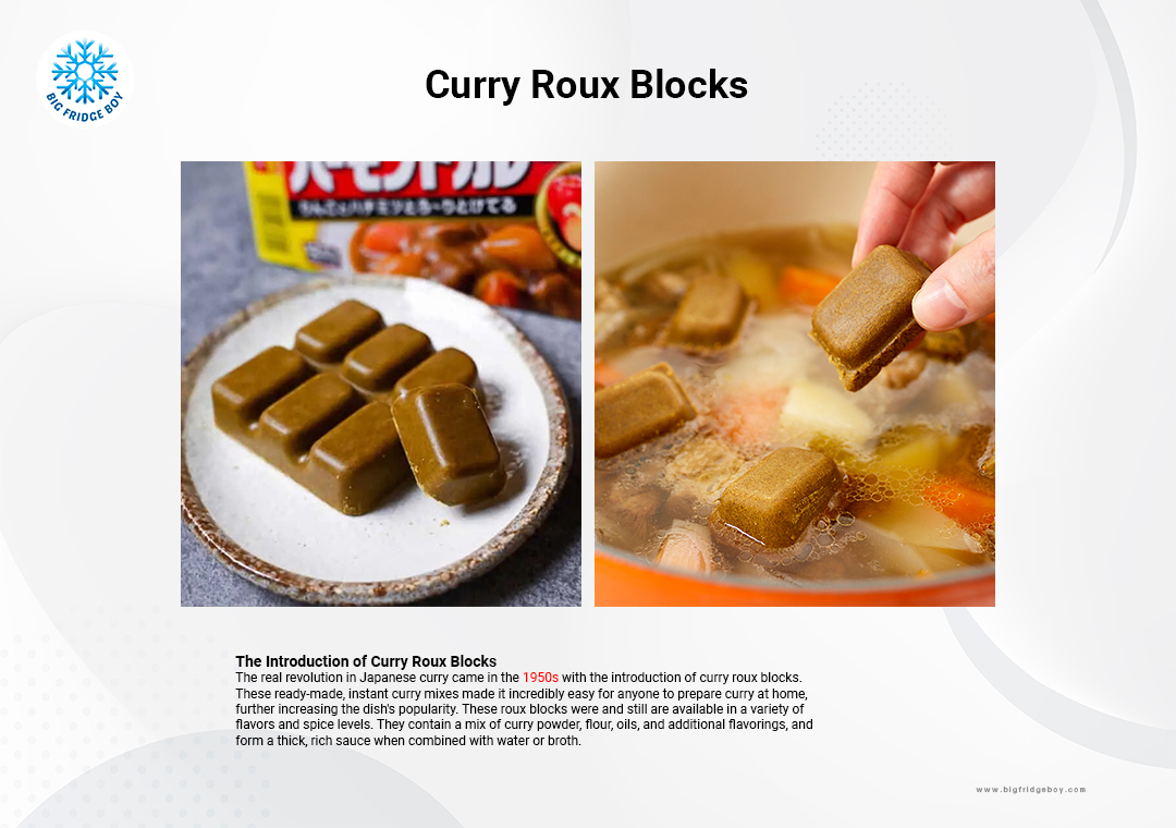 The real revolution in Japanese curry came in the 1950s with the introduction of curry roux blocks. These ready-made, instant curry mixes made it incredibly easy for anyone to prepare curry at home, further increasing the dish's popularity. These roux blocks were and still are available in a variety of flavors and spice levels. They contain a mix of curry powder, flour, oils, and additional flavorings, and form a thick, rich sauce when combined with water or broth.
