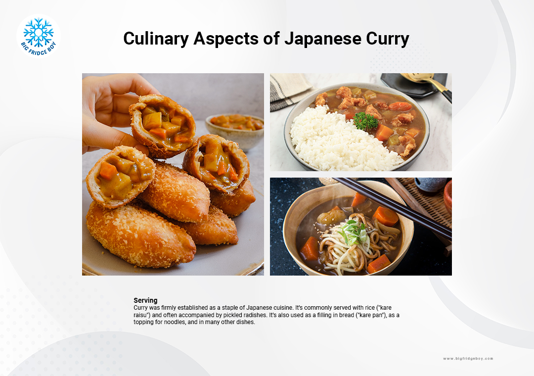 Curry was firmly established as a staple of Japanese cuisine. It's commonly served with rice ("kare raisu") and often accompanied by pickled radishes. It's also used as a filling in bread ("kare pan"), as a topping for noodles, and in many other dishes.