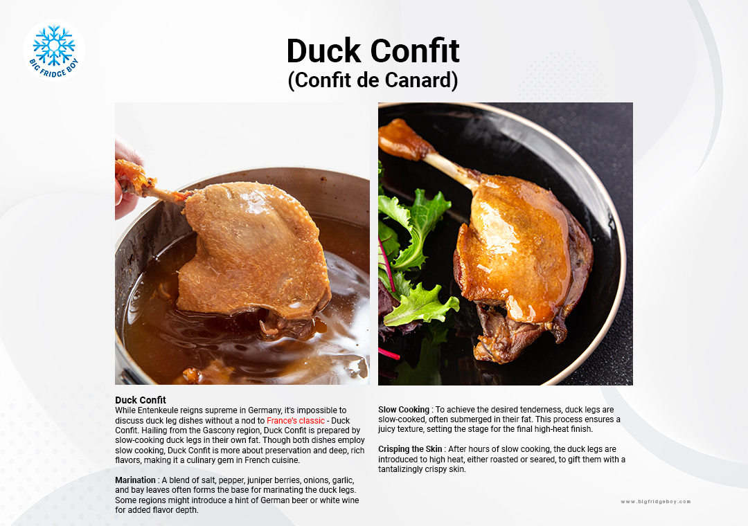 While Entenkeule reigns supreme in Germany, it's impossible to discuss duck leg dishes without a nod to France’s classic - Duck Confit. Hailing from the Gascony region, Duck Confit is prepared by slow-cooking duck legs in their own fat. Though both dishes employ slow cooking, Duck Confit is more about preservation and deep, rich flavors, making it a culinary gem in French cuisine.