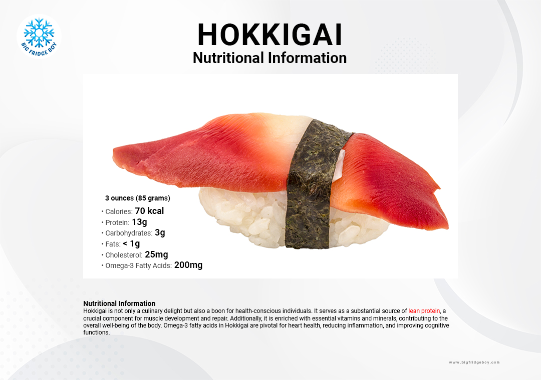 Hokkigai is not only a culinary delight but also a boon for health-conscious individuals. It serves as a substantial source of lean protein, a crucial component for muscle development and repair. Additionally, it is enriched with essential vitamins and minerals, contributing to the overall well-being of the body. Omega-3 fatty acids in Hokkigai are pivotal for heart health, reducing inflammation, and improving cognitive functions.